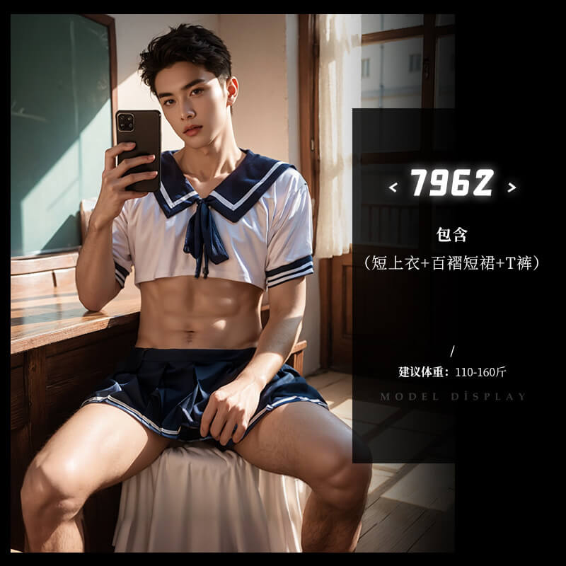 ◆7962◆深藍+白【短上衣+百褶短裙+T褲】
