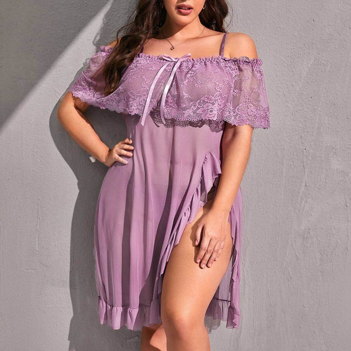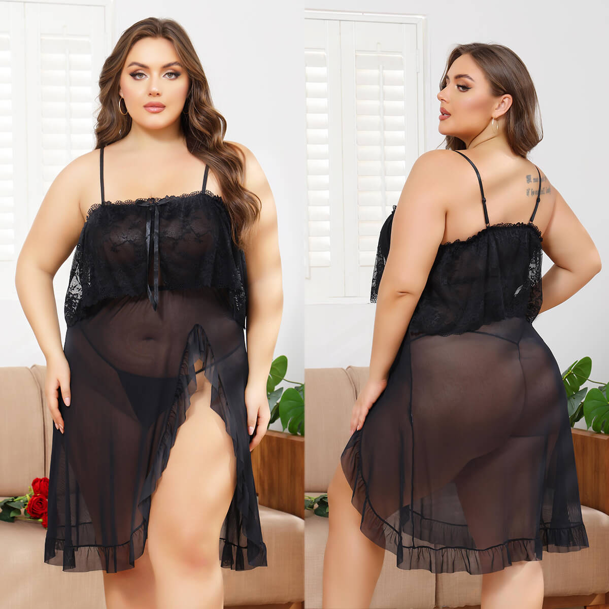 【性感開叉情趣睡裙】新款蕾絲胖MM情趣內衣!大碼透視吊帶露肩睡衣性感透明蕾絲情趣長裙!
