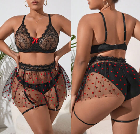 【性感情趣睡裙套裝】胖MM大碼情趣內衣三點式配吊襪帶性感透明蕾絲套裝