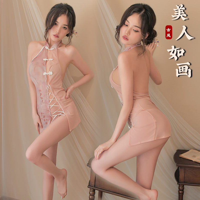 內衣_風韻猶存_性感古風夢蝶盤扣镂空綁帶透視旗袍情趣內衣