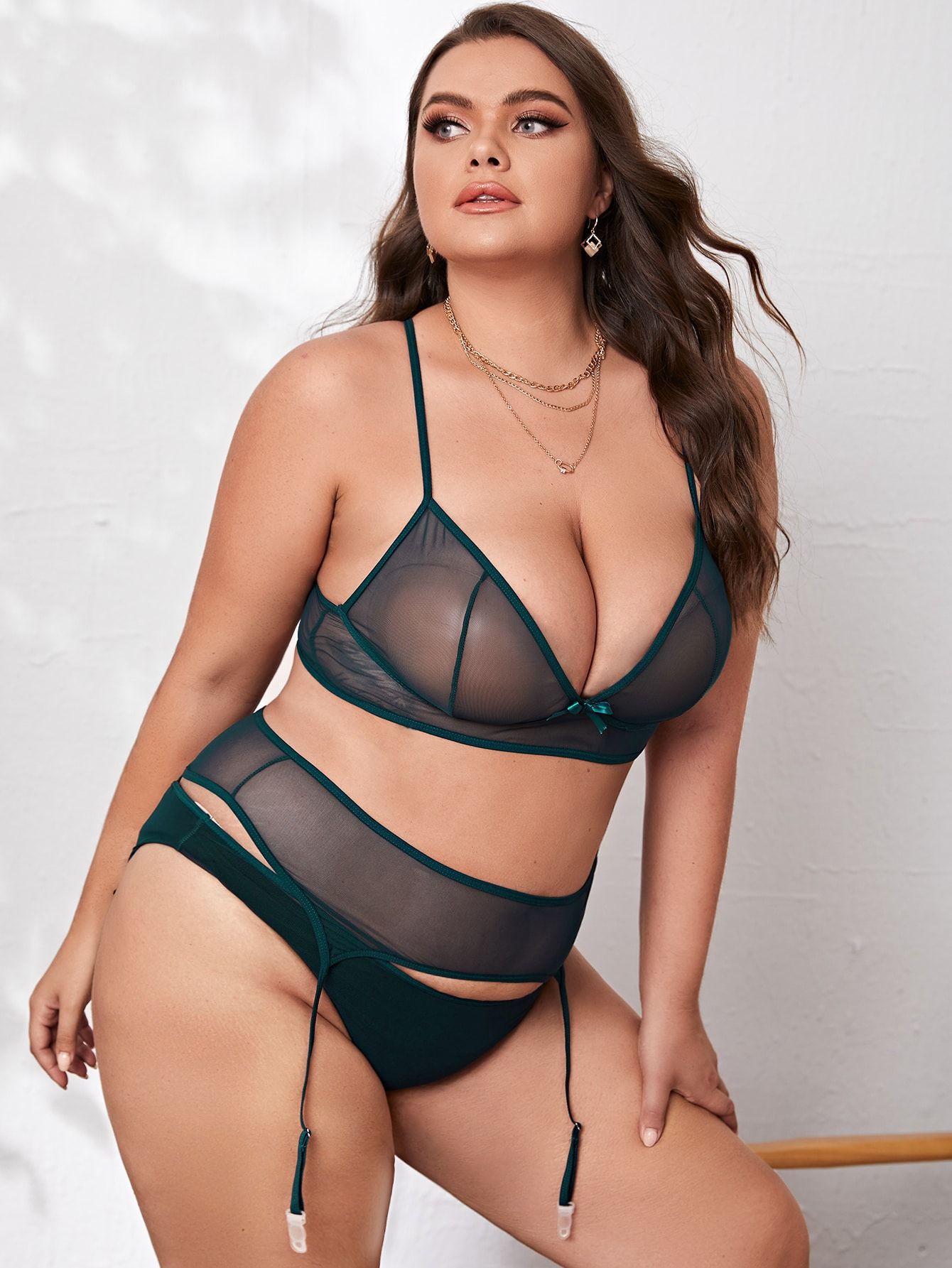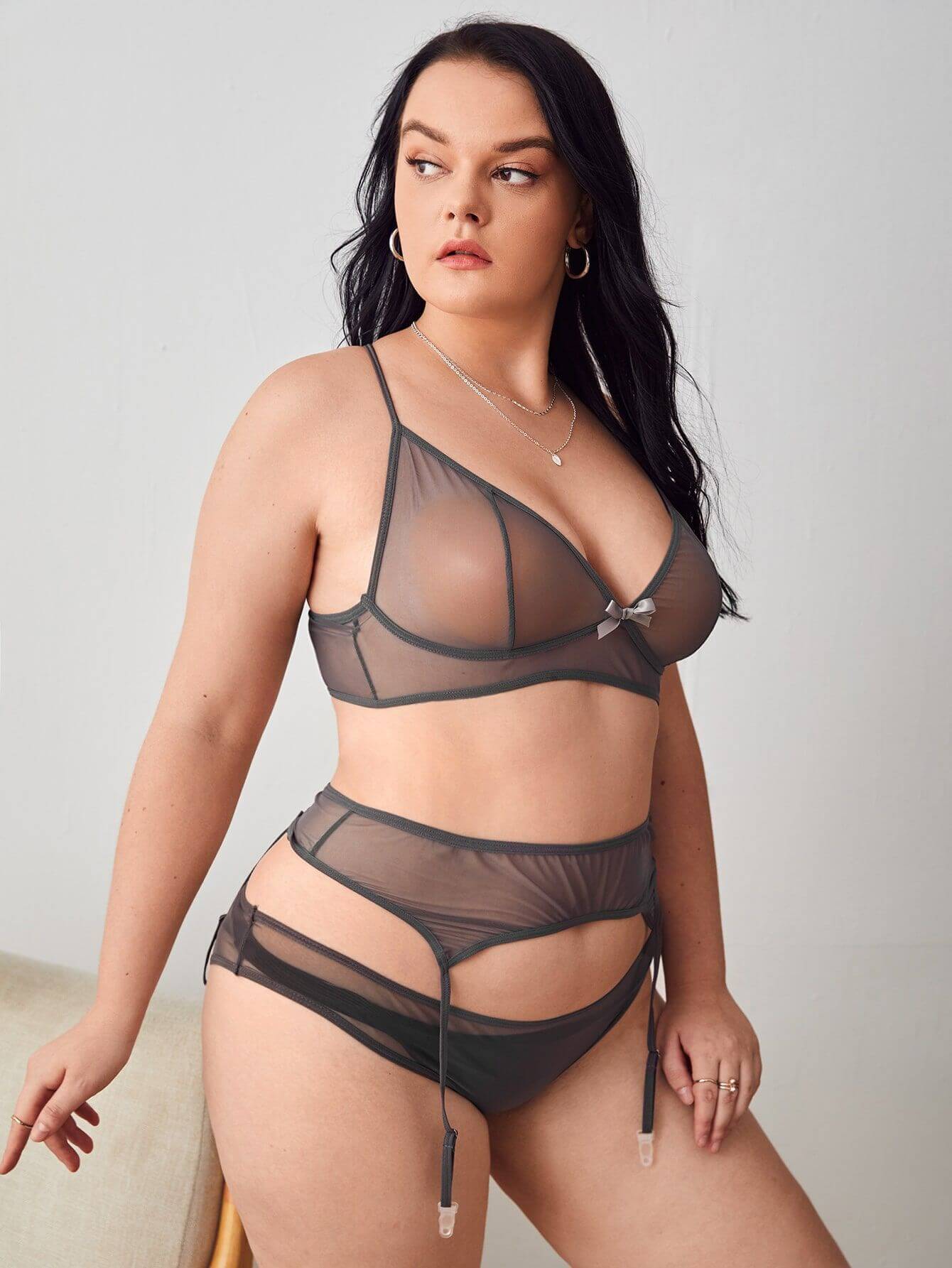 【性感網紗三件套 7色可選】大碼胖MM網紗三點式套裝配吊襪帶分體衣性感情趣內衣