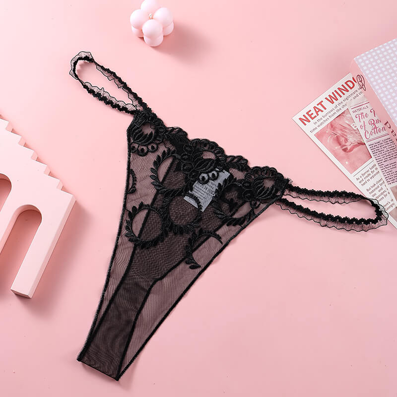 丁字褲~情侶款激情火辣蕾絲情趣内褲黑金色新款刺繡性感透明女士丁字褲